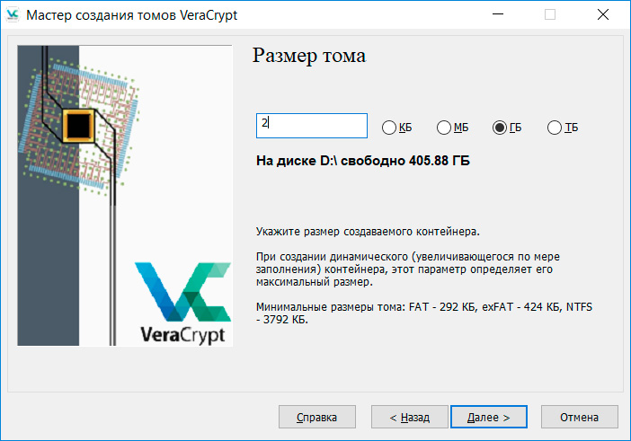 Теперь задаем размер контейнера. Единицы измерения можно выбрать - например, гигабайты.