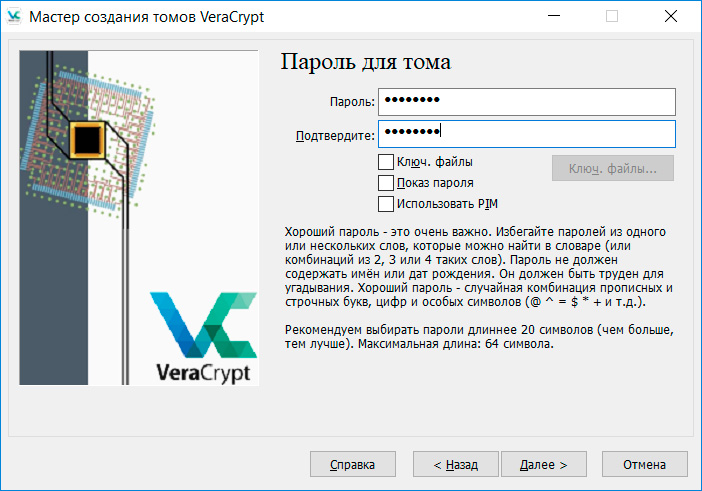 Задание пароля к контейнеру. В качестве дополнительных средств защиты можно использовать ключевые файлы (без них нельзя будет подключиться к контейнеру) или PIM ("Персональный умножитель итераций", усложняющий подбор пароля перебором).