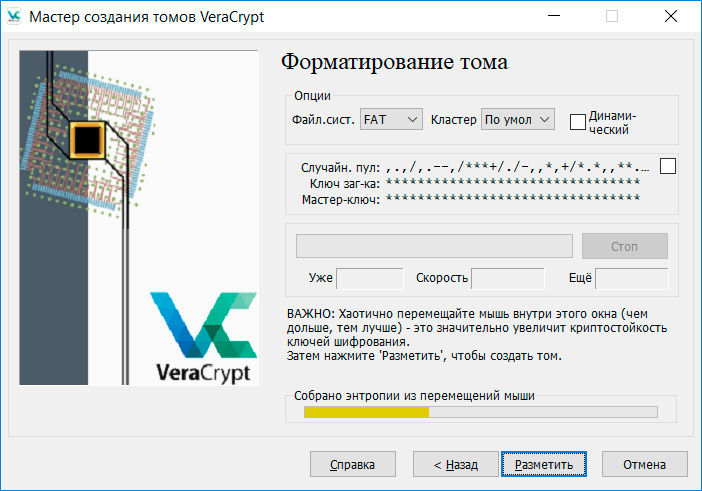 Далее программа вас попросит поперемещать курсор мыши туда-сюда, чтобы увеличить криптостойкость ключей шифрования, ну и после этого нужно нажать кнопку "Разметить".