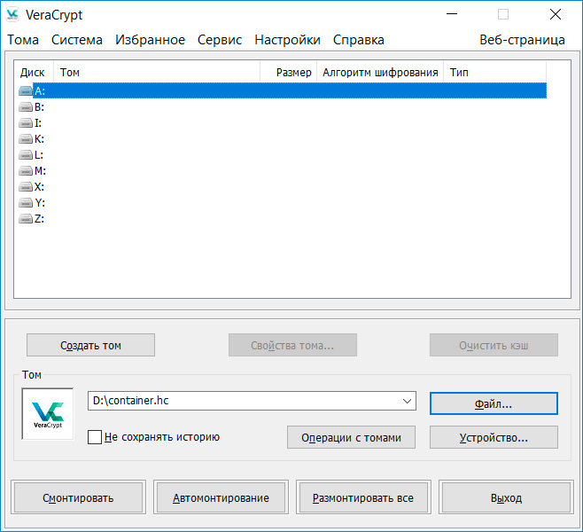 Также в основном окне программы можно включить опцию "Не сохранять историю" - тогда там не будет видно, какие файлы контейнеров вы вообще использовали. И эти файлы для безопасности можно хранить, например, среди данных каких-нибудь других программ, и тогда только вы будете знать, что эти контейнеры вообще существуют.