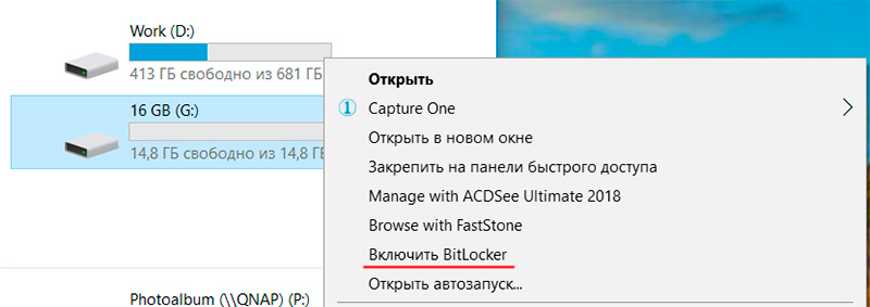 Работает это следующим образом. Подключаете флешку (или внешний диск) к компьютеру. В "Этот компьютер" на значке подключенного устройства щелкаете правой кнопкой мыши и в контекстном меню выбираете "Включить Bitlocker".