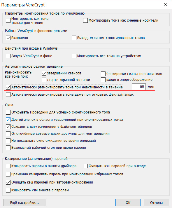 Кстати, обратите внимание, что в меню "Настройки - Параметры" можно задать автоматическое размонтирование контейнеров через определенный период неактивности. Это полезно для безопасности, а то мало ли что.