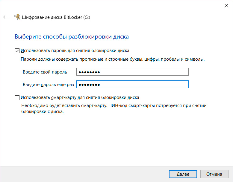 В следующем окне выбираете "Использовать пароль для снятия блокировки диска" и там два раза вводите соответствующий пароль. Разумеется, он должен быть достаточно защищенным, и у меня есть плохие новости: варианты password, password123 и petya123 не годятся.