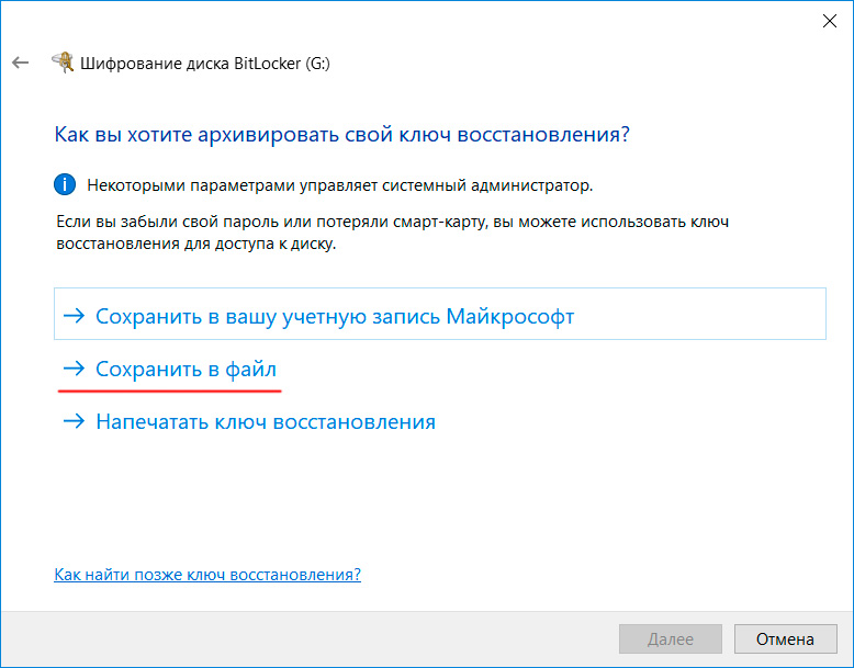 Далее вы можете предусмотреть восстановление доступа к флешке, на случай если вы забудете пароль. Если вы на компьютере используете учетную запись Майкрософт, а не локального пользователя, то можно сохранить ключ в учетной записи. Также его можно сохранить в файл (это обычный текстовый файл) или распечатать.
