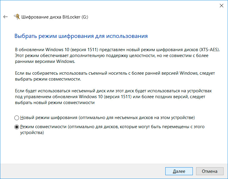 Выбор режима шифрования: для внешних накопителей, конечно же, нужно выбирать режим совместимости.