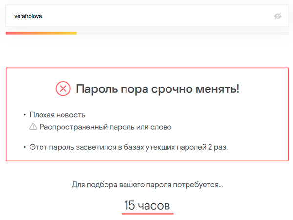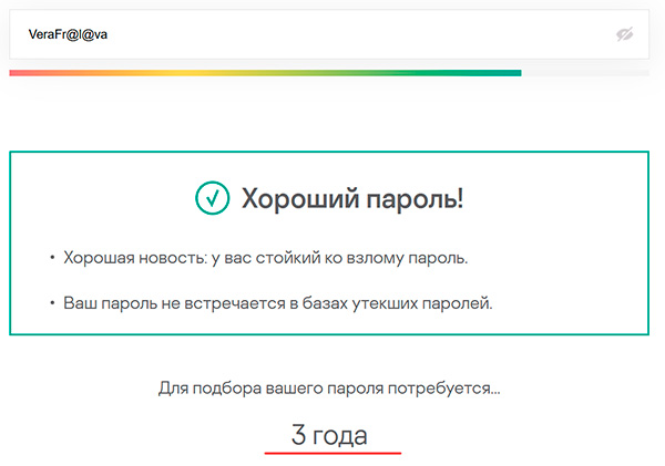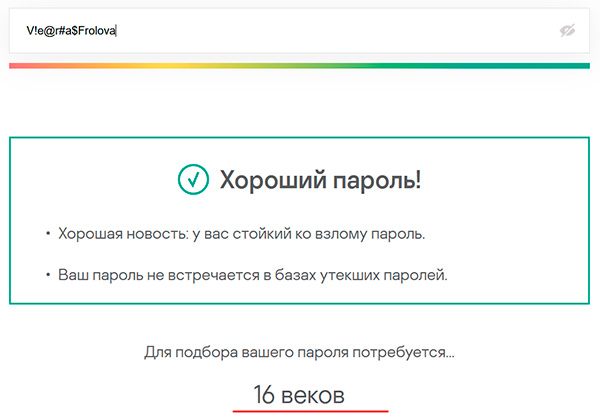 Напишите ее имя и фамилию латинскими буквами в одно слово - verafrolova. Давайте проверим этот пароль в специальном сервисе от "Касперского" (это в любом случае безопасно, потому что мы проверяем сам принцип, а не конкретный пароль, который будем использовать).