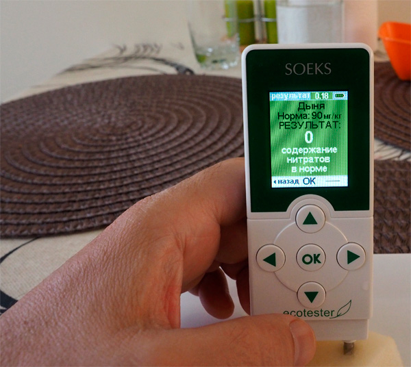 Но я дал дыне отдохнуть, измерил еще раз - слава богу, нитраты испугались и ушли совсем. Причем я на всякий случай воткнул щуп в то же отверстие, в котором измерял только что, - ну, мало ли, может, нитраты где-то кучкуются.