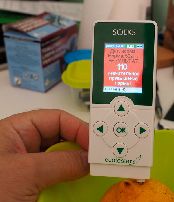 Так вот, выставляете "Детская норма", меряете "содержание нитратов" в каком-то произвольном продукте, а так как этот прекрасный "прибор" совершенно спокойно гоняет произвольные числа от 0 до 200, то высока вероятность того, что он "намеряет" где-то 120 и разорется о том, что данный продукт смертельно опасен для вашего ребенка. Какой родитель после этого не выкинет этот смертельный банан, помидор или лимон? Да любой выкинет. Вместе с деньгами, выкинутыми на покупку самого продукта и этого "нитратомера".