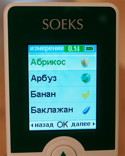 Работает это все очень просто. Включаете, выбираете "Нитратомер". Там идет список из овощей, фруктов, также есть отдельные пункты "Зелень", "Мясо", "Детская норма". Собственно, название продукта влияет только на показатель максимального содержания нитратов в нем, более ни на что.