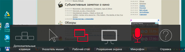 Четвертая пиктограмма - настройки. Там можно включать дополнительные клавиши (которых нет на клавиатуре планшета), включать-выключать указатель мыши, переключаться на рабочий стол удаленного компьютера, выбирать масштаб отображения, включать-выключать микрофон и получать справку-подсказку.
