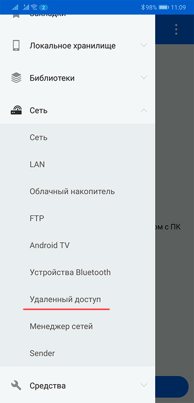 Для этого на смартфоне надо запустить удаленный доступ через FTP. У некоторых производителей такая возможность встроена прямо в файловый проводник, но если этого нет, то нужно просто установить бесплатную программу "ЕS Проводник". В ней в меню открываете Сеть - Удаленный доступ.