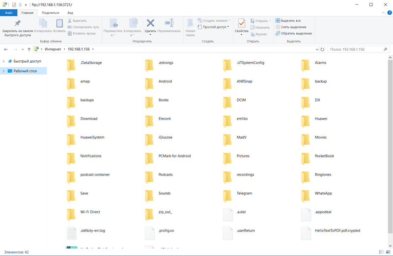 Второй вариант, тоже очень простой, - доступ через FTP. В этом случае вы получаете доступ к папкам смартфона прямо в проводнике.