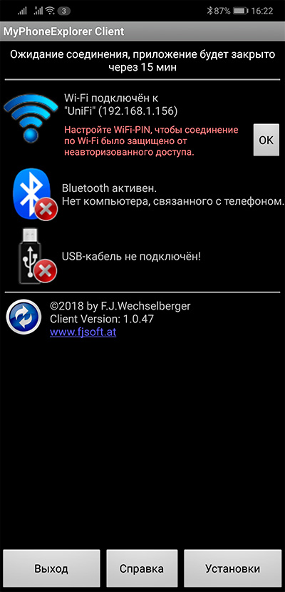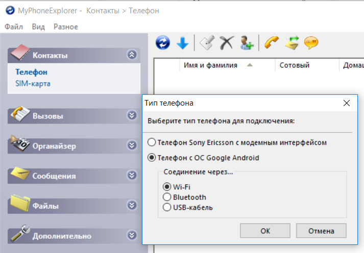 А для ПК с Windows нужно скачать программу-сервер MyPhoneExplorer, которую можно взять, например, вот здесь. При первом запуске выбираете вид подключения.