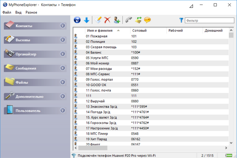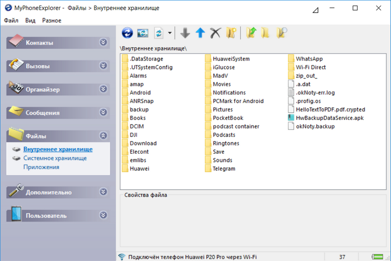 Ну и после этого происходит сопряжение с телефоном. И тут вам становятся доступны не только файлы, но и контакты (которые могут сохраняться в этой программе на ПК), вызовы, календарь и сообщения.