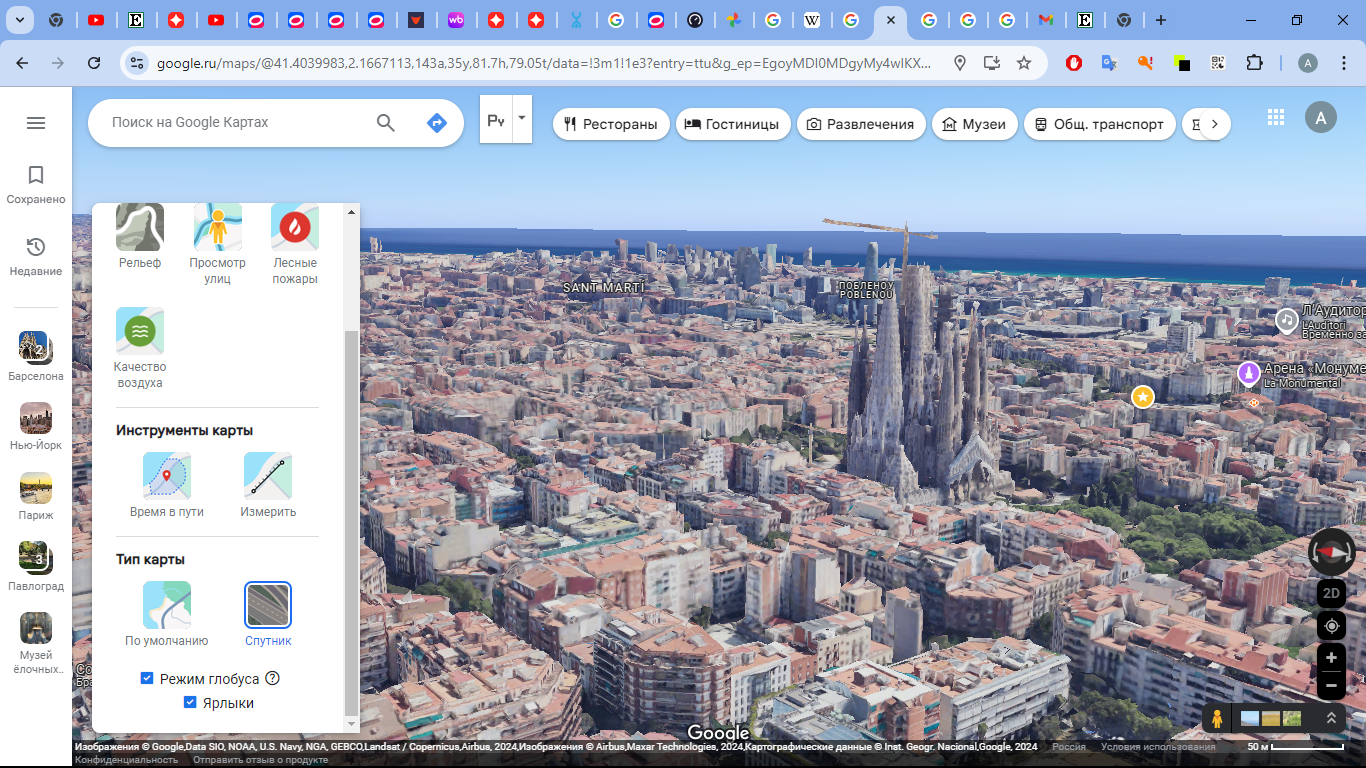 Режим "глобус" в просмотре спутниковой версии. Появляется переключатель 2D/3D.
