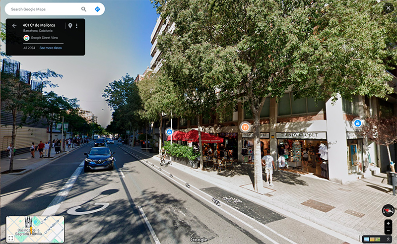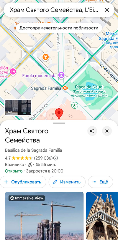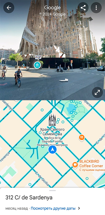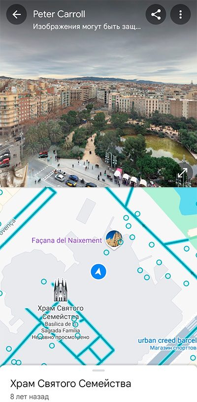 На скриншоте слева - улица, справа - круговая панорама, снятая из Храма святого семейства в Барселоне.