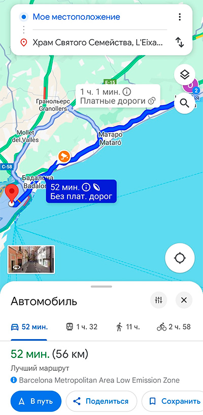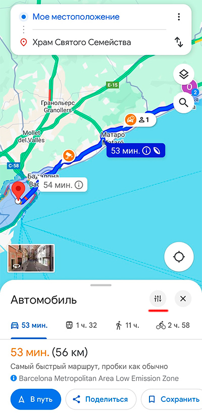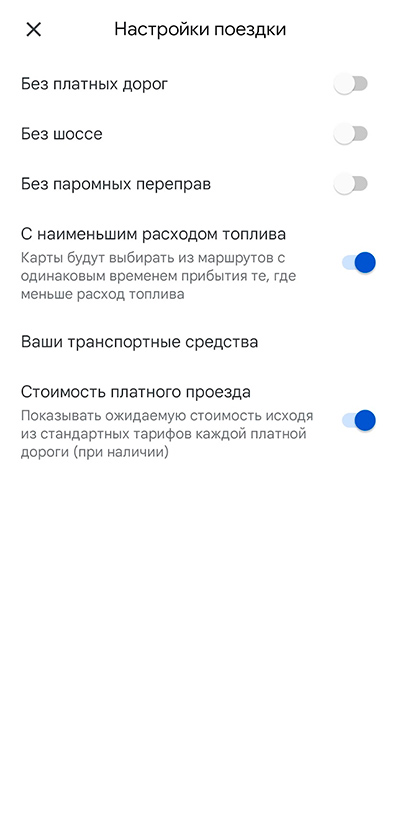 Здесь самый важный момент - "Без платных дорог". Эту опцию нужно включить, если вы хотите избегать платных дорог, ну и, соответственно, выключить, если вы готовы платить, чтобы добраться как можно быстрее.