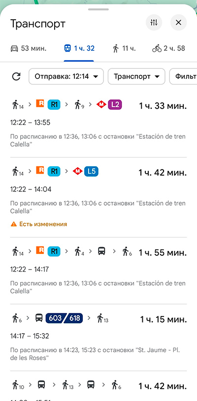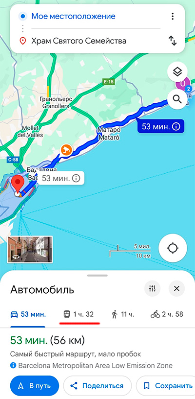 Когда вы задали маршрут и нажали на кнопку "Маршрут" - перед вами появляется окошко с вариантами перемещения. По умолчанию там автомобиль, но есть еще общественный транспорт, велосипед и пешком. Если выбрать общественный транспорт, то Карты Google предложат различные варианты того, как добраться до нужной точки общественным транспортом. Причем во время поездки, например, на электричке, она будет показывать, мимо каких станций вы проезжаете, и сколько вам еще ехать. Я неоднократно этим пользовался - удобно. Отдельное приложение Citymapper неcколько более удобное и разнообразное, но если его нет под рукой, то Карты Google в этом плане выручат.