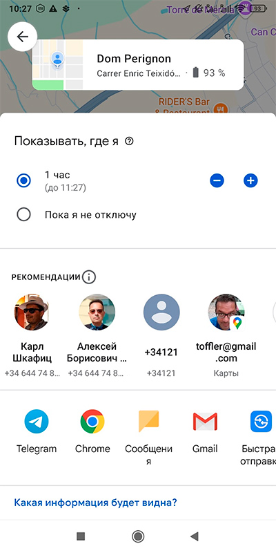 Очень полезная возможность: вы можете делиться своим местоположением в течение какого-то срока или же неограниченно, и тогда ваши абоненты будут видеть, где вы находитесь. Да, конечно, трансляцию геопозиции умеют делать и другие приложения - те же WhatsApp (до 8 часов, не больше) и Телеграм (умеет делиться постоянно), но там-то это только точка на карте, а в картах Google вы можете, например, сразу построить маршрут до абонента, что бывает очень удобно.