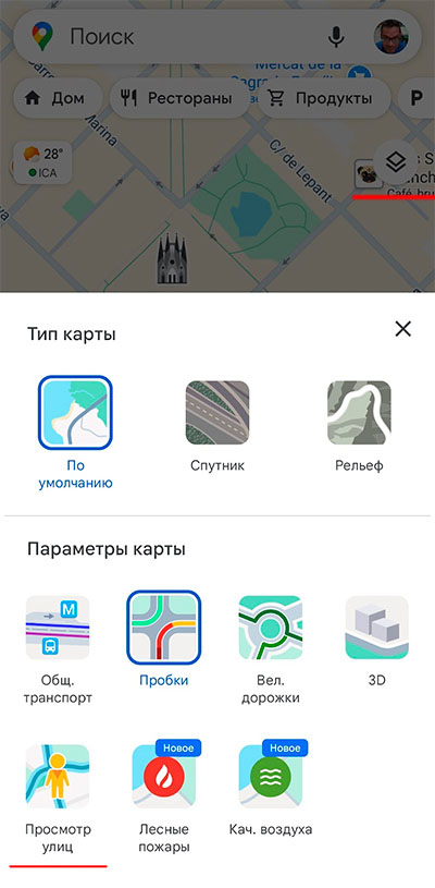 В приложении на смартфоне для этого нужно щелкнуть по пиктограмме слоев (она расположена справа сверху), выбрать "Просмотр улиц", а потом щелкнуть по нужной синей полоске на карте.
