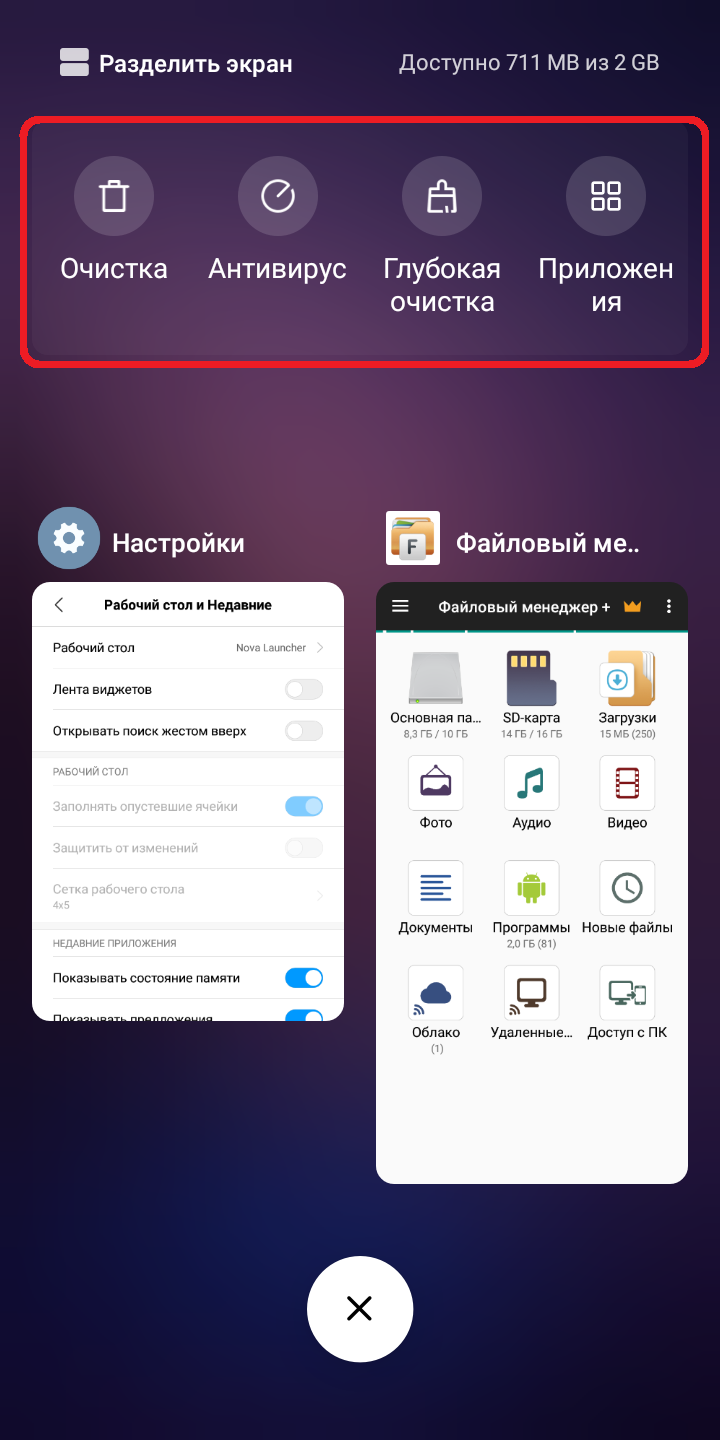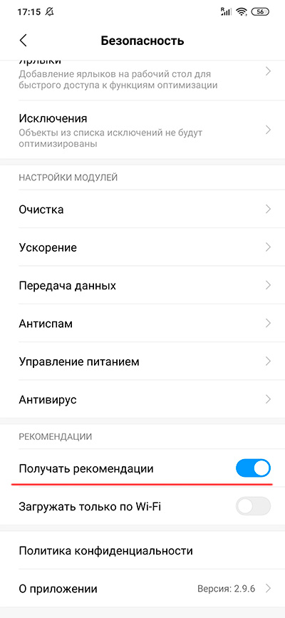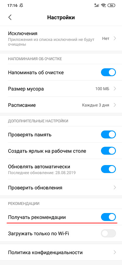 Приложение "Очистка" - выключить "Получать рекомендации".