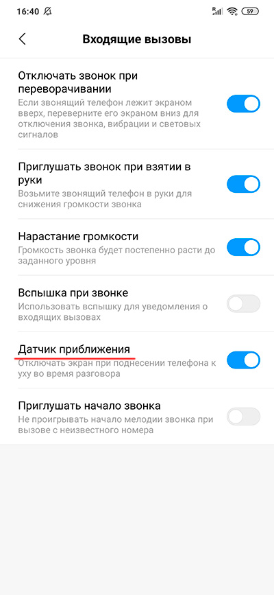 Найти можно через поиск в настройках "Датчик приближения" или через меню приложения "Телефон - Входящие вызовы". Там же, кстати, есть еще несколько полезных опций.
