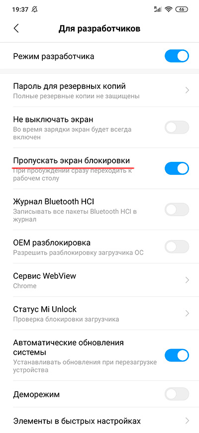 После этого режим разработчика станет доступен в "Настройки - Расширенные настройки". И там включить "Пропускать экран блокировки".