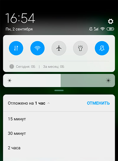 У Xiaomi сделано еще удобнее. Приложение нужно сдвинуть влево (если вправо - оно просто исчезнет с экрана) - там появятся две пиктограммы: настройки и отложить на время.