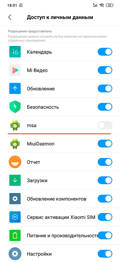 В настройках доступа к личным данным приложений - отключить такой доступ у приложения msa. Кстати, с первого раза это, скорее всего, не сработает - система напишет, что не смогло отозвать доступ. Операцию просто нужно повторить - тогда сработает.