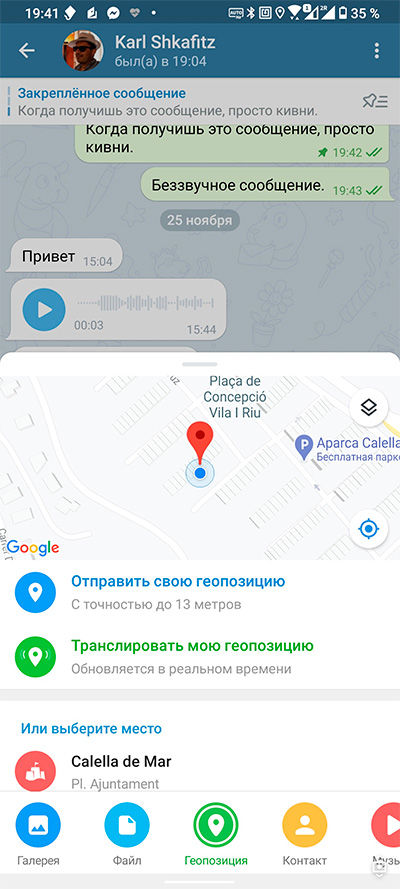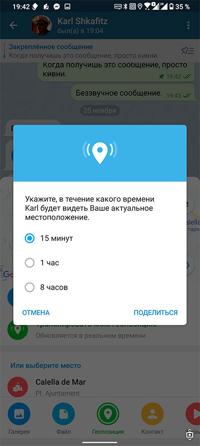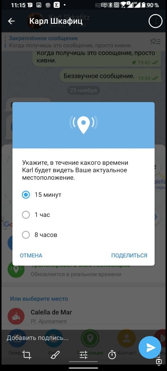 Вы можете как показать другому пользователю свое местоположение, так и делиться с ним своим местоположением в реальном времени. При нажатии на значок "Приложить" нужно нажать на "Геопозицию" и там выбрать: отправить текущую геопозицию, делиться в течение какого-то времени, диапазон времени можно выбрать: 15 минут, 1 час, 8 часов.