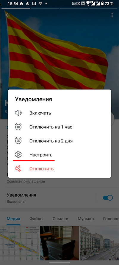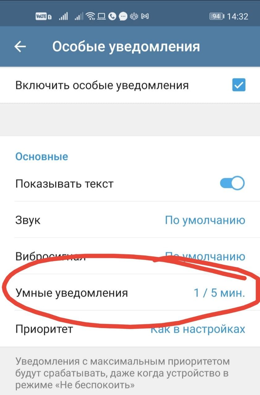 Иногда их не обязательно совсем отключать, и в телеграмме есть очень удобная штука - умная настройка уведомлений, например, не чаще 1 уведомления в 5 минут от конкретного чата, или не больше 5 уведомлений в 1 минуту от другого чата (количество и время можно настроить).