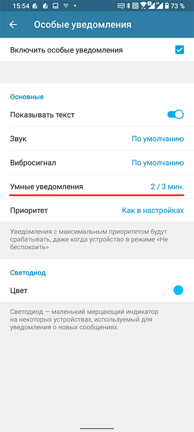 И в нем нужно нажать "Настроить" - появится следующее окно. Самое интересное там - "умные уведомления". При нажатии на этот пункт появляются вот такие варианты - скриншот справа. То есть вы можете задать, например, делать не более одного уведомления в пару минут: так вы и уведомления от канала сохраните, и они не будут вас постоянно "дергать", если в канале или группе идет большое количество сообщений. Ну и также можно менять звук: то есть вы по звуку сможете определять, в каком канале пришло сообщение.