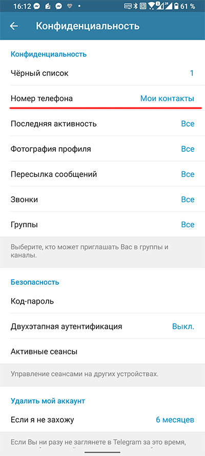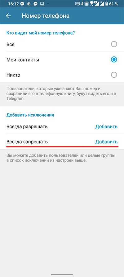 Еще этот способ настройки нужен для того, чтобы вас не предлагали для общения в Telegram тем пользователям, у которых в телефонной книге есть ваш номер, - если вы этого не хотите.