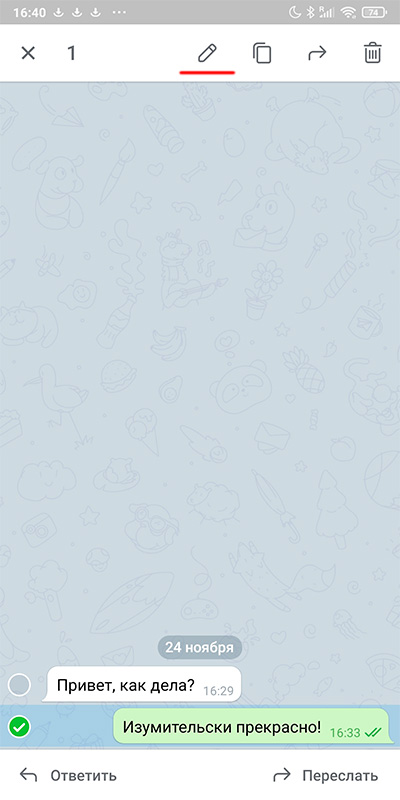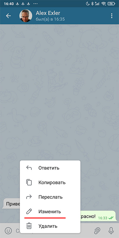 Два способа. Щелкнуть по самому сообщению - тогда появится контекстное меню с соответствующим пунктом; или же нажать на сообщение и подержать - тогда появится меню множественного выбора, где также можно отредактировать сообщение, если выбрано только одно.