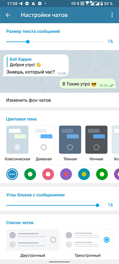 При этом и дневной режим, и ночной можно настраивать в широких пределах: Общее меню - Настройки - Настройки чатов.