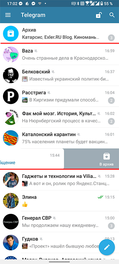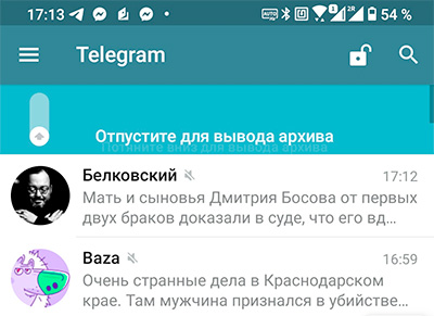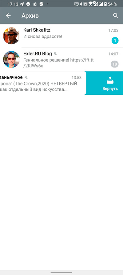 Чтобы перенести чат/канал в архив, его нужно просто смахнуть вправо (левый скриншот). При этом над списком чатов появится раздел "Архив". Внутри него чаты/каналы выглядят точно так же, как и в обычном списке, просто они объединены в отдельной папке. Чтобы вернуть чат на верхний уровень из архива, его там нужно смахнуть влево (правый скриншот).