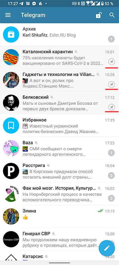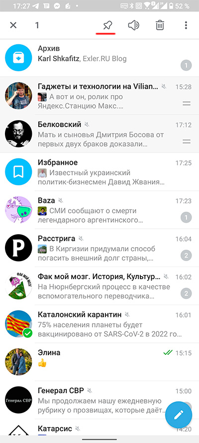 Если какого-то абонента или канал вы читаете чаще всего и хотите, чтобы он всегда находился в списке сверху независимо от того, есть в нем новые сообщения или нет, то его можно закрепить в верхней части. Для этого длинное нажатие на чат/канал, нажать значок "Пришпилить" (левый скриншот). Закрепленные чаты/каналы будут в самом верху над "Избранным" (правый скриншот).