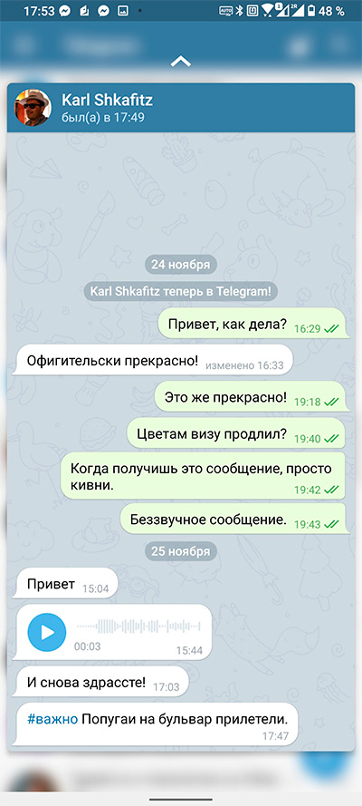 Само собой работают практически все возможности из оригинального приложения. Из минусов - все новые фишки появляются чуть позже чем в офф. телеграме.