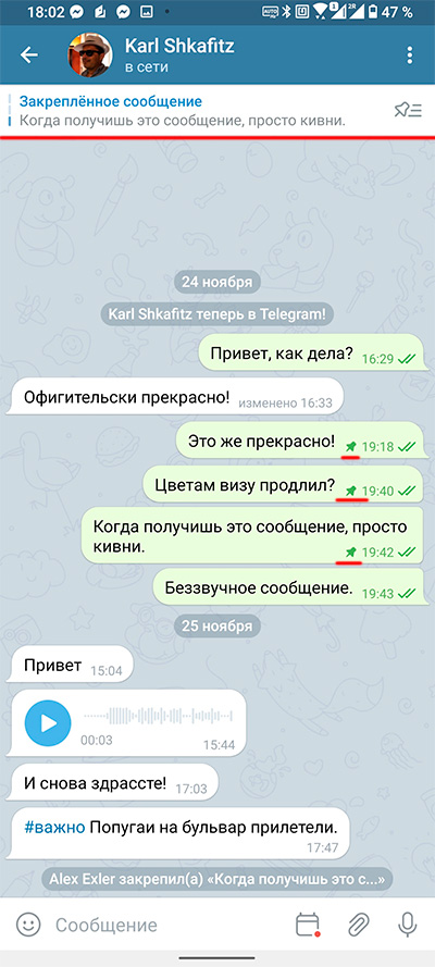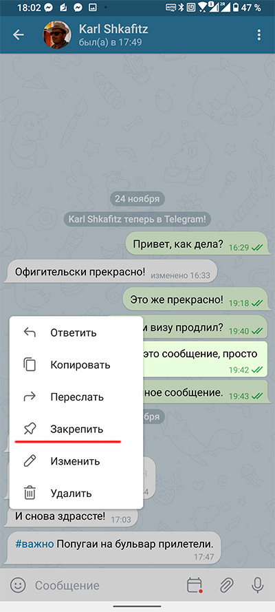 Какие-то из присланных сообщений чата бывает нужно сохранить, чтобы не потерять. Для этого нужно нажать на сообщение и в появившемся меню выбрать "Закрепить". При этом также можно закрепить это сообщение и у вашего абонента - Telegram дает такую возможность.