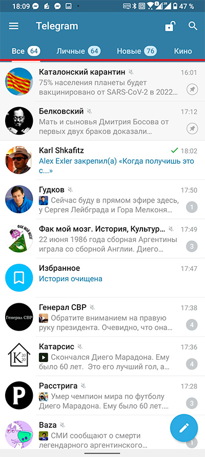 Ещё добавка - ограничение по суммарному количеству каналов / чатов - 500. Возможно, в Telegram X больше. Также в Telegram X можно прикрепить больше пяти каналов / чатов, надеюсь, это перейдет в основной клиент.