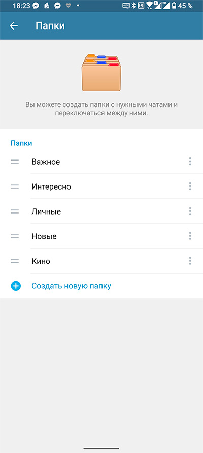 И теперь наш Telegram выглядит вот так: сверху идет группировка чатов/каналов по вкладкам. Если папок/вкладок становится слишком много, то они просто скроллируются по горизонтали. Порядок папок вы можете задавать в настройках: подцеплять папку за три полоски слева и перемещать на нужное место.