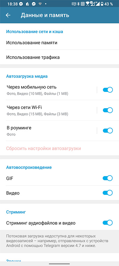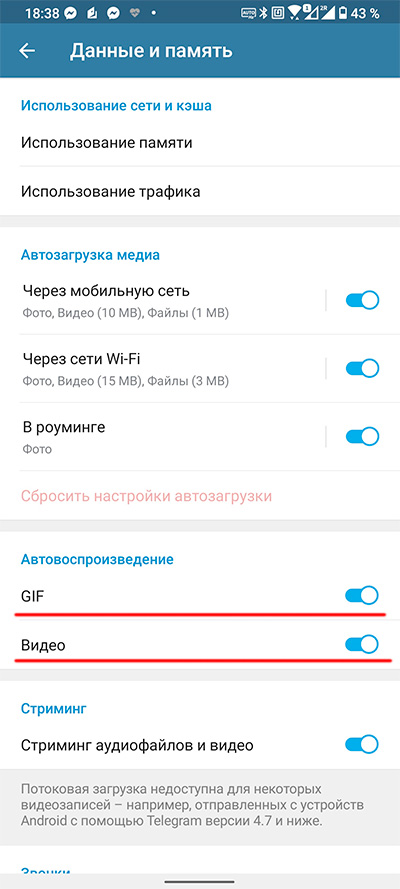 Кстати, многих пользователей раздражает автовоспроизведение анимационных GIF и видео - это отключается в том же разделе "Данные и память".