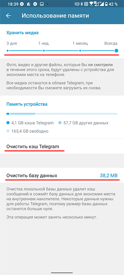 Если Telegram активно используется, то на смартфоне накапливается немало мусора, который желательно удалять. Это делается в Общее меню - Настройки - Данные и память. Там Использование памяти.