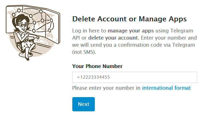 Telegram вам пришлет в чате длинный проверочный код, который нужно будет ввести в окне. Если код правильный, то появится небольшое меню, где среди всего прочего будет пункт "Удаление аккаунта".