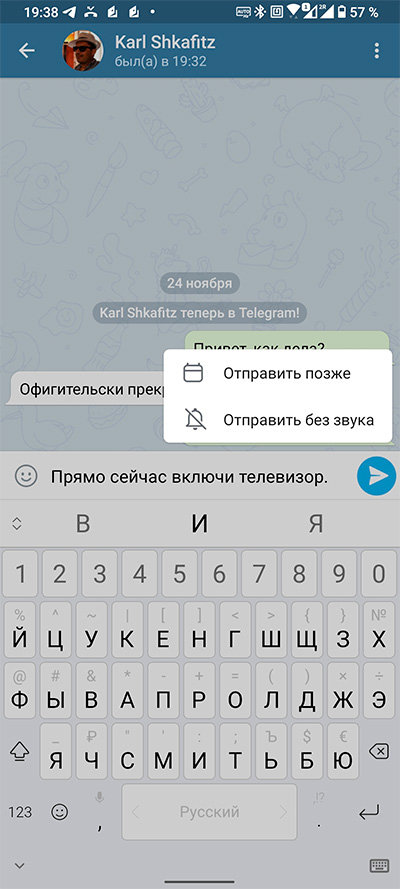 "Отправить без звука" - тоже интересная возможность. Такое сообщение беззвучно прокрадется на смартфон абонента, даже если у него/нее звук включен на полную. Отличная штука для внесемейной любовной переписки - так абонент не попалится. Впрочем, если у него/нее супруга/супруг возьмет телефон, чтобы порыться в переписке, то тут уже беда, но другой вопрос, зачем вообще жить с партнером, который роется в твоем смартфоне и тебе не доверяет, правильно? С другой стороны, заметил кот Бублик, а чего тебе вообще доверять, если у тебя - внесемейные отношения? Это, заметил кот Бублик, опустошает! Как тебя, так и семейный кошелек!