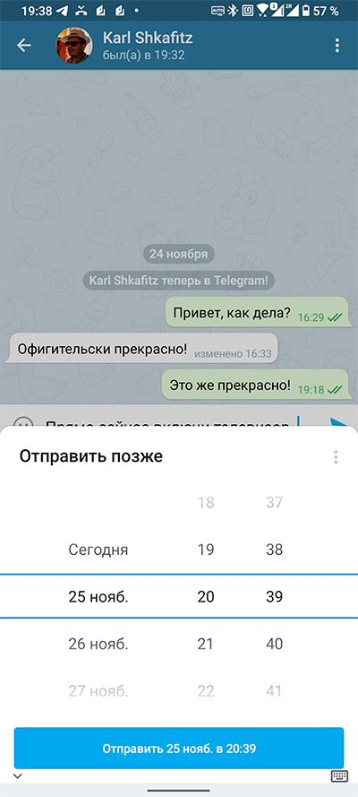 "Отправить позже" - запланировать точную дату и время отправки сообщения. Очень полезная возможность для тех, кто любит, находясь в легкой поэтической эйфории, писать сообщения бывшим: им нужно просто запланировать отправить сообщение на следующей день, когда эйфория уже пройдет, - это даст время прочитать сообщение и понять, нужно ли его отправлять вообще. Также этой возможностью можно пользоваться для напоминаний самому себе: например, отправлять напоминалочку на другой свой аккаунт.