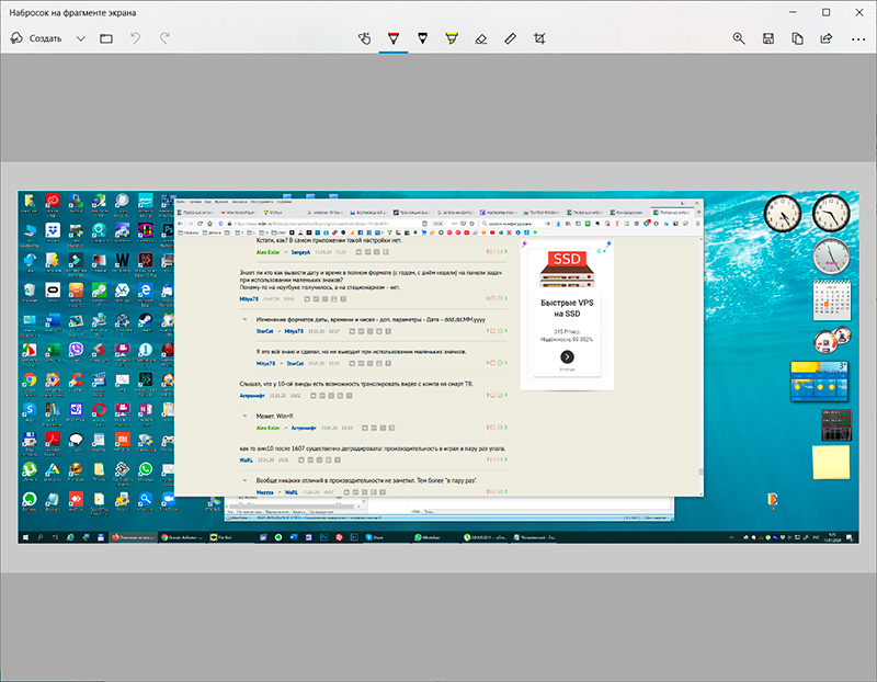Также с помощью сочетания Win+W можно сразу вызывать редактор "Набросок на фрагменте экрана" с полноэкранным скриншотом.