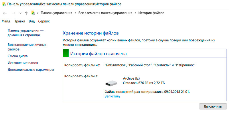 Настраивается она в Панели управления - История файлов. Там вам нужно выбрать диск, на котором будут храниться версии файлов. Если на компьютере диск один, то, значит, на нем, а если два или вы используете какие-то локальные файлохранилища - тогда выбрать соответствующий диск.