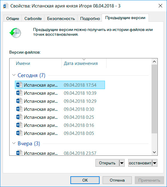 Далее, если у вас вдруг что-то не то произошло с важным документом, просто в его свойствах (правая кнопка мыши на файле) открываете закладку "Предыдущие версии", после чего восстанавливаете то, что нужно, - хоть все изменения каждые десять минут. Это очень удобно.
