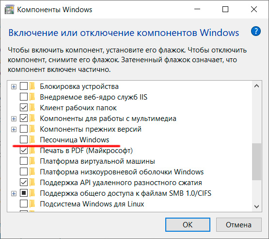 Включаете "Песочница Windows", нажимаете на ОК, система потребует перезагрузиться. После перезагрузки среди приложений появится Windows Sandbox.
